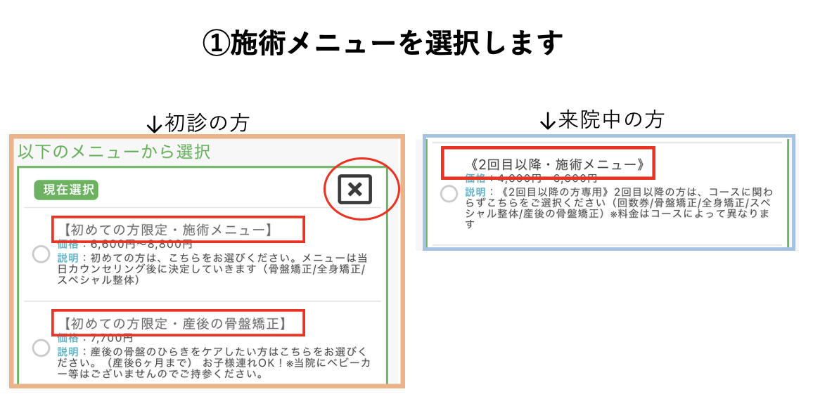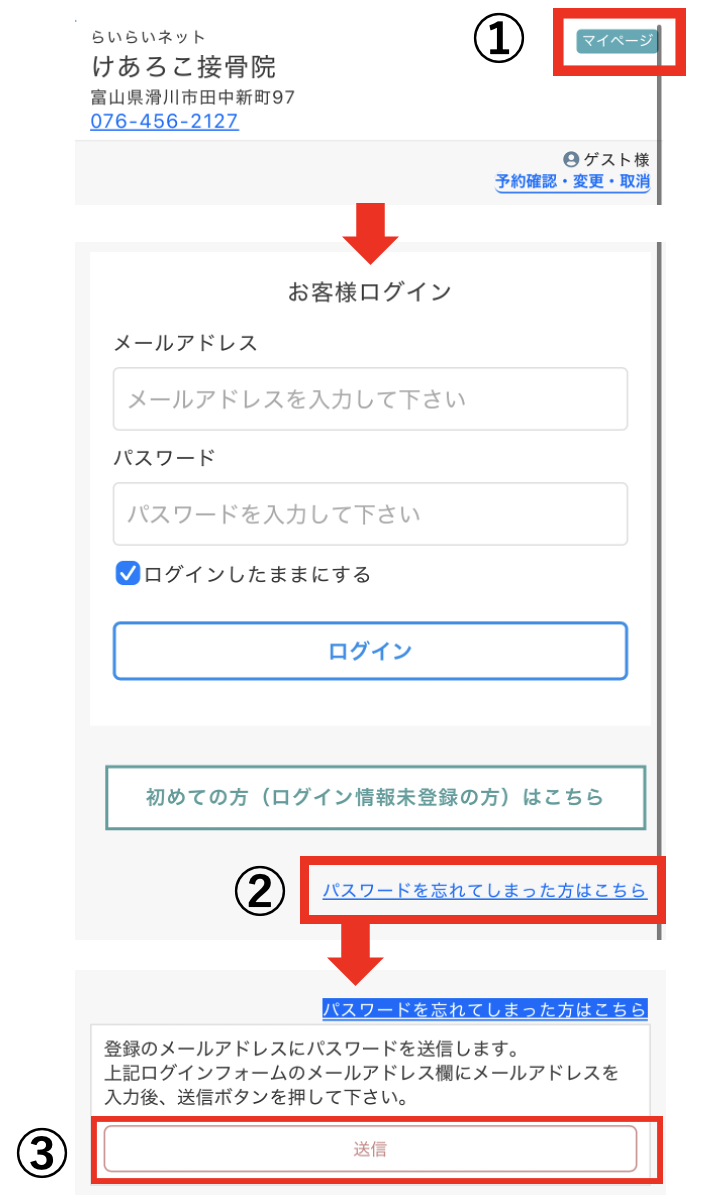 予約選択ページの右上「マイページ」をタップし、「初めての方(ログイン情報未登録の方)はこちら」の右下にある【パスワードを忘れてしまった方はこちら】をタップします。